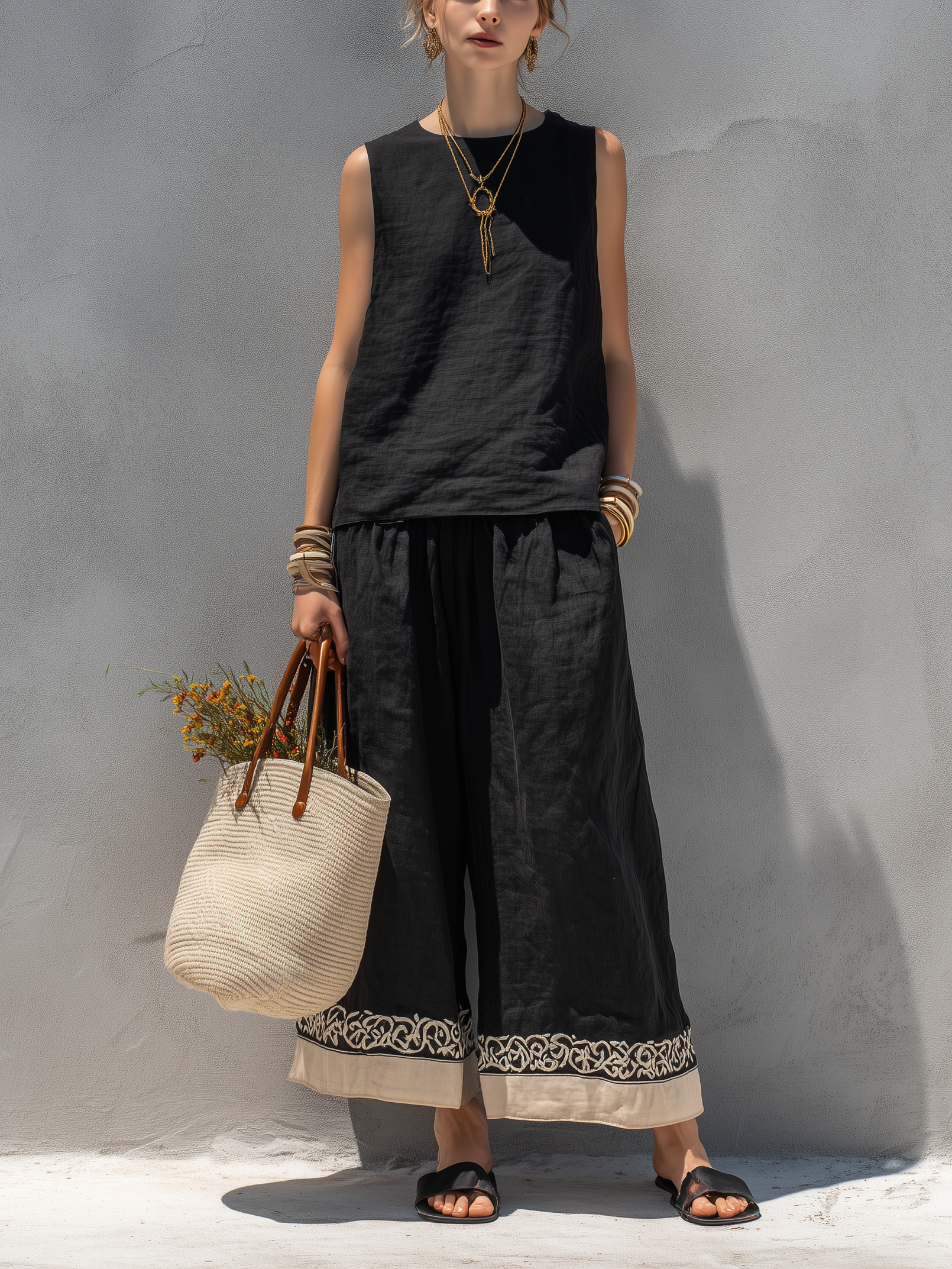 Women's Embroidered Print Sleeveless Solid Color Cotton Linen Top And Loose Wide-leg Pants Two-piece Set
