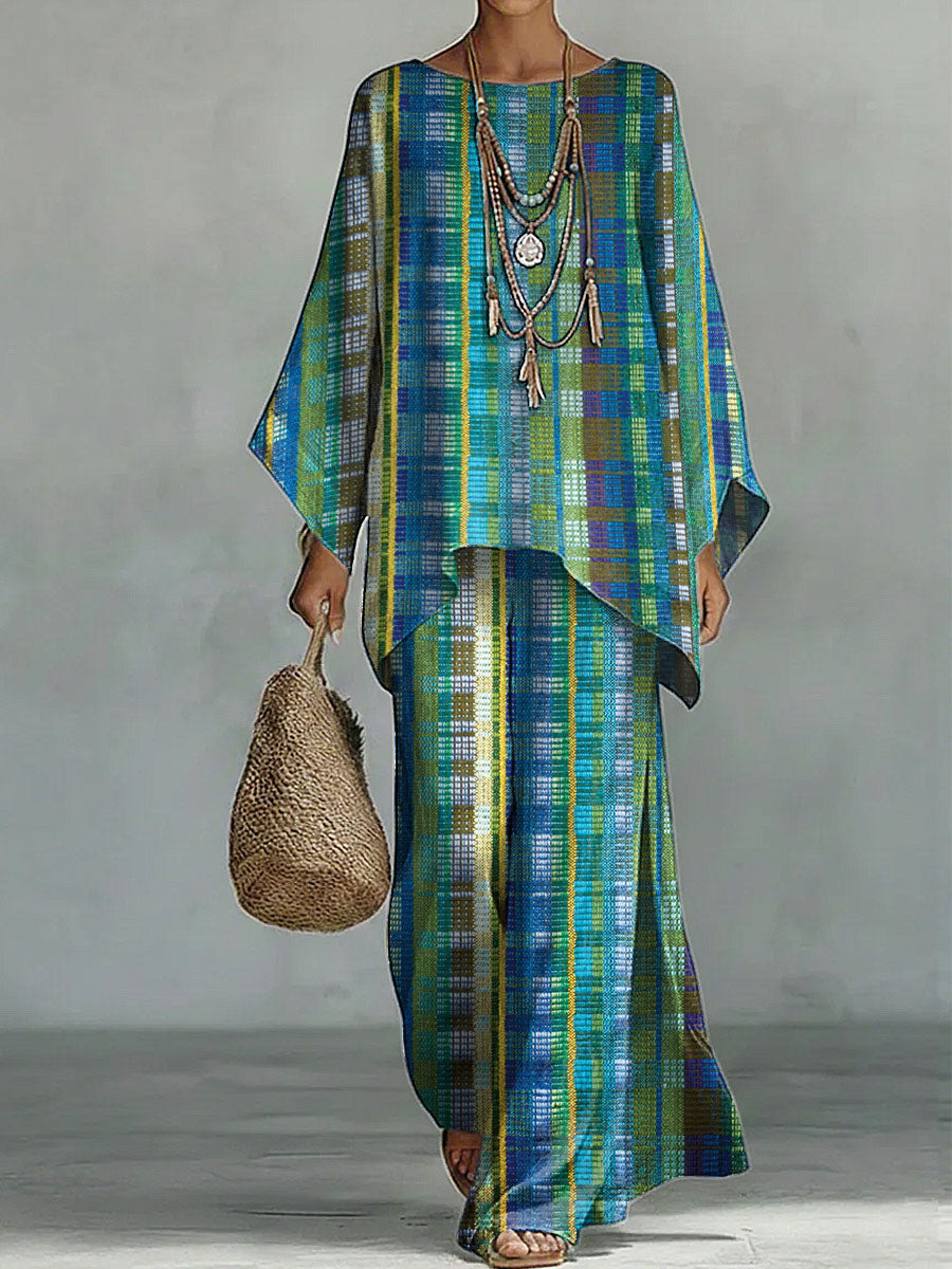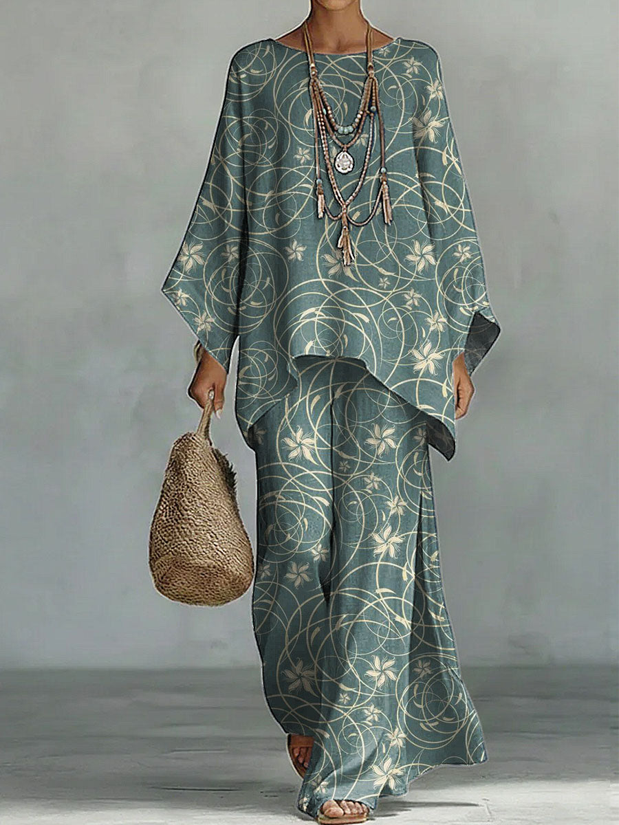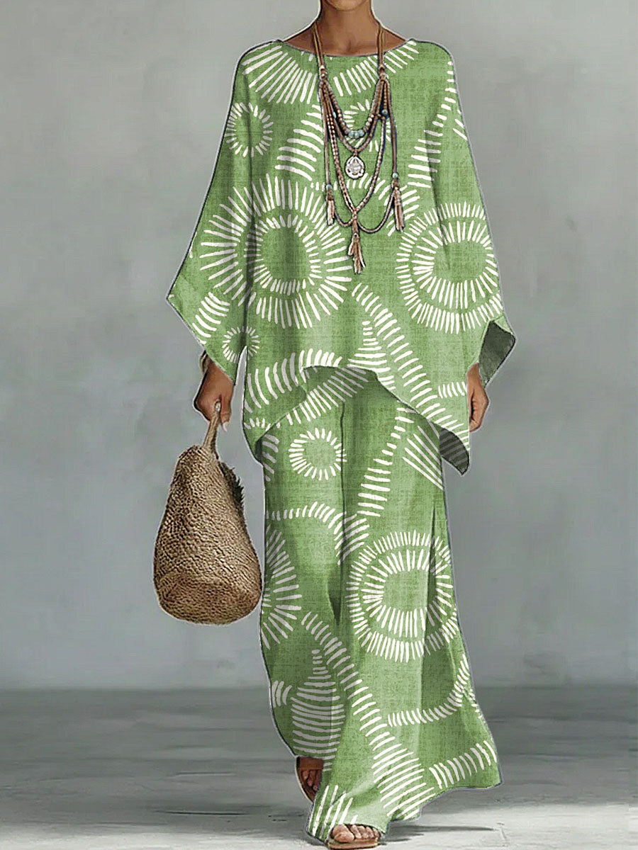 Women's Geometry Print Linen Cotton Top And Wide-leg Pants Two-piece Set.